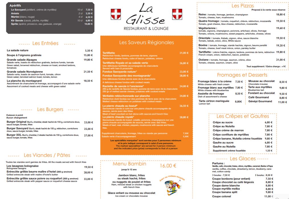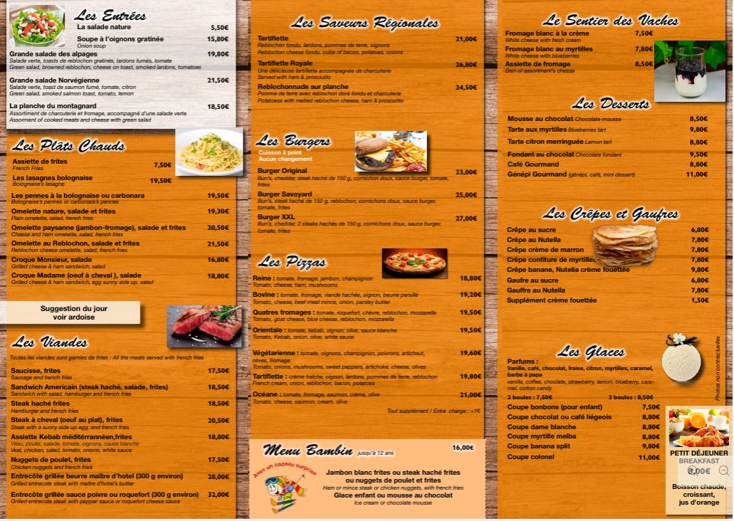 Service du soir : Ambiance chalet : Spécialités savoyardes Pizzas Menu enfant Pâtes Grillades Burgers ...